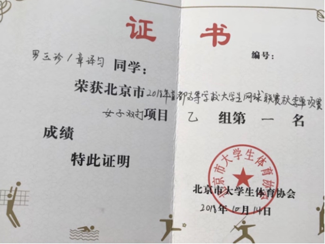 2018年首都高等学校大学生网球联赛秋季单项赛于2018年10月13至21日,在北京化工大学、中国人民大学、中央民族大学、国际关系学院同时开赛。我校普通学生网球队在体育部王力老师带领下参赛,经过近半月赛场激烈角逐,取得女双乙组冠军、女单乙组第五名优异成绩,创造我校普通学生网球队同类赛事参赛最好成绩。