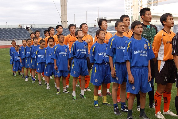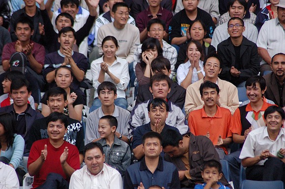 热情好客的新疆观众在为运动员鼓掌加油,既热烈又有节奏,而且口号也有着鲜明的民族特色。由于今年也是新疆历史上第一次组队参加职业足球联赛,球队既得到了自治区有关部门和企业的大力支持,主场也设在了新疆自治区体育中心,这座竣工不久可容纳5万名观众的体育中心在乙级联赛所有场地中可谓条件最好,每场比赛也吸引了大量的热心观众(最多一次观众达2万余人,创乙级联赛观众人数最高记录),所以无论从场地条件、观众人数,还是大家文明观赛的程度,都不愧为乙级联赛的第一主场。