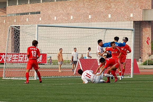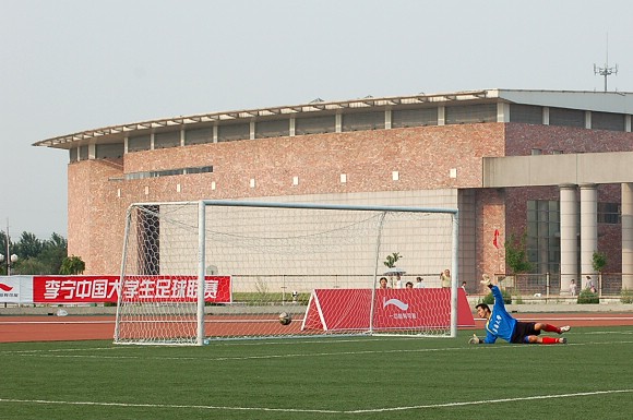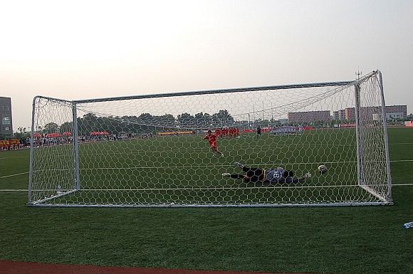 在紧张而又激烈的点球大战中,我校足球队率先罚球,且五射五中,而东华大学足球队虽也三罚三中,但在罚第四轮点球时,罚球队员高度紧张,犹豫不决,射出点球低平偏正且力道不足,我方守门员王毅判断准确将球扑出,对方的第五轮罚球已无必要。最终我校足球队以总比分6:4力克劲敌东华大学,从而在重新夺回大学生足球联赛冠军的道路上扫平了一个重要障碍。