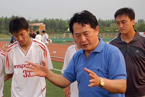 中场休息时,总教练金志扬在向队员们做战术指导,勉励队员一定要敢打敢拼,争取把胜利保持到最后时刻。