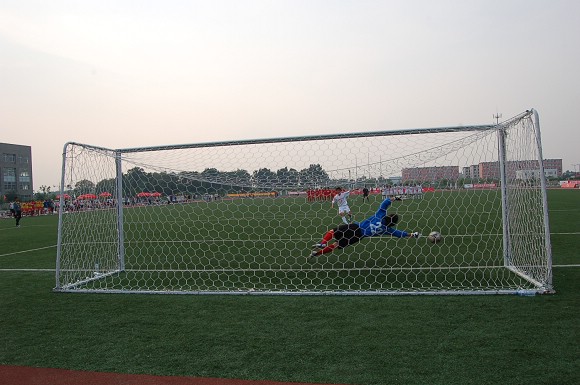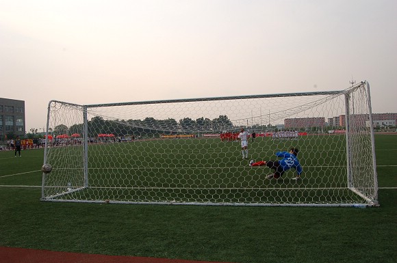 东花大学第三次也命中,但我方守门员王毅的准确判断险些将球扑出。