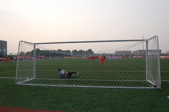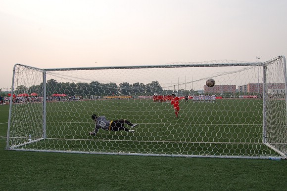 第四轮罚球,我方由8号队长袁微出场,他巧妙骗过对方守门员,点球命中。