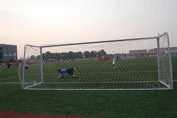 在紧张而又激烈的点球大战中,我校足球队率先罚球,首先由“点球专家”6号队员于飞首罚,他骗过了对方守门员,直接命中网底。