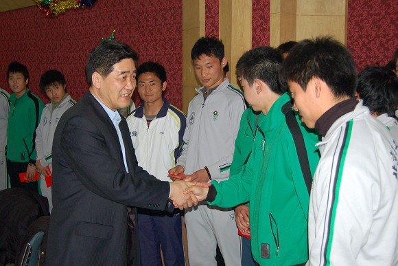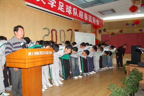团拜会上首先由bb贝博艾弗森官方网站党委副书记、副校长杨宾发言,他首先对多年来上级单位、各类媒体、企业界对bb贝博艾弗森官方网站足球队的一贯支持表示感谢!杨宾副书记回顾了bb贝博艾弗森官方网站足球队的发展历程,以及2006年足球队冲甲的辉煌一刻。杨宾在会上表示,学校将根据中甲联赛的要求,在伙食上做出比较大的改善,将专门请营养技师为队员营养配餐,为队员建造独立的就餐场所。以保障他们在训练和高对抗比赛中所需的营养。此外在学习中,学校将根据赛程调整课程,在利用业余时间请学校最好的老师进行文化课的辅导。同时在训练中加强科学性,把在韩国所学充分延续,以提高训练效果为主进行有效果的训练,而不是以训练时间为标准。他最后强调,希望队员要有使命感,要有荣誉感,要充分表现出体育回归教育的理念。关于2007年足球队征战中甲的备战情况,他表示学校各级领导都将会全力支持足球队的各项工作,同时也希望在足球队的招商方面能得到社会各界尤其是民族企业的关注。