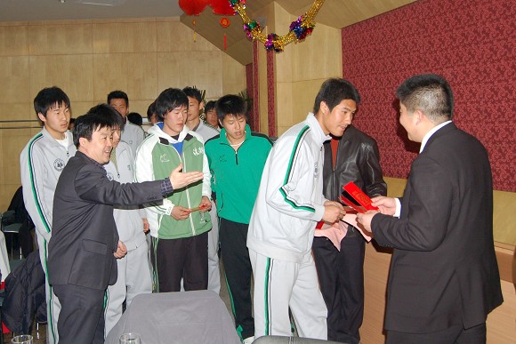 与会领导和嘉宾还一起向足球队全体队员发放了过年红包,希望大家回家之前为父母准备一些礼物,尽到孝心。