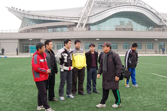 金志扬主教练在向测试裁判组成员介绍球队冬训备战情况。