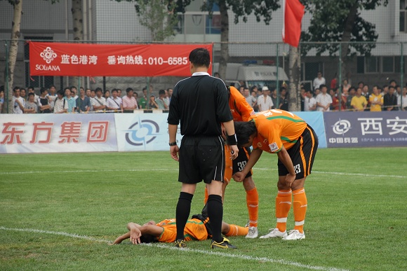 也许是轻敌的缘故,广州医药队一上来踢得有些漫不经心。而学生军面对劲敌丝毫没有放弃,大家都鼓足了劲奋力一搏。比赛前20分钟双方各有破门机会,广药并没能在学生军身上占到便宜。相反,爱国者大学生队频频通过反击威胁广药的防线,第26分钟,韩国留学生金俊植左路带球狂奔10余米后大力抽射,球稍微高出广药大门。第29分钟,爱国者大学生队队长袁微被广州医药外援撞伤,一分钟后他再次被踢中,受伤不轻,被担架抬出场外后才再次回到场上。