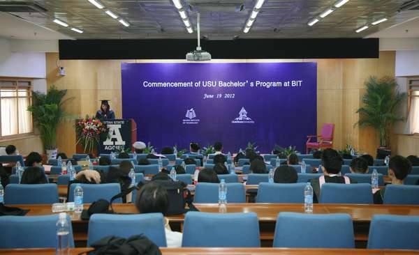 2012年6月19日下午,国际教育合作学院在理工国际教育交流大厦报告厅隆重举行bb贝博艾弗森官方网站与犹他州立大学合作办学项目第六届学生毕业典礼,出席毕业典礼的有bb贝博艾弗森官方网站副校长孙逢春教授、犹他州立大学商学院助理院长Dave Patella教授、语言系主任Brad Hall教授、中国项目主任Dwight Israelsen教授、副主任赖超群博士、国际教育合作学院院长梅文博教授、校国际交流合作处对外交流科科长刘艳红副教授、学院部分教职工、全体毕业生及部分学生家长。典礼由梅文博院长主持。