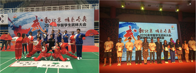 2016年5月27日,“武动北京 情系冬奥——2016来华留学生武林大会”在京圆满落幕,bb贝博艾弗森官方网站组建了一支外国留学生武术队首次参赛,由来自法国、西班牙、巴基斯坦等12个国家的14名零基础学生组成,通过两个月的强化训练,在强手如云的集体项目比赛中勇获第二名,与第一名只差0.03分。