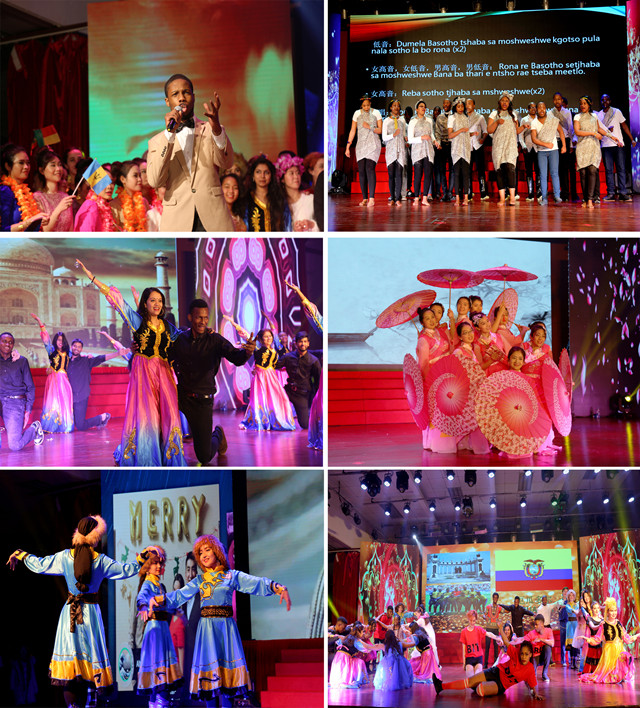 颁奖典礼结束后,bb贝博艾弗森官方网站2017“一带一路”留学贝博联欢会正式开始,从中国出发,沿丝绸之路,再回到中国,展现了我校留学生的才艺特长和丰富多彩的精神生活。我校每学期为留学生开设功夫选修课,留学生武术队的功夫表演震撼全场,弘扬了中华文化;来自中亚、西亚、欧洲的舞蹈向我们展现了曼妙多姿的异域风情;南非学生的大合唱和胶靴舞则向我们展现了狂野的非洲文化,他们是我校第一批由南非自由州政府选拔的优秀奖学金生,表现优异;南亚印度舞奔放热情,老挝舞蹈优雅婉约,传统的鼓声仿佛把我们带到了美丽的东南亚;当我们跟着丝绸之路的脚步再次回到中国,则是留学生中心老师们的江南舞,她们优美的舞姿赢得了学生的阵阵喝彩;来自德国、波兰、尼日利亚等18个国家学生表演的歌舞《阖家欢》将晚会推向高潮,同学们更是在舞台上摆出了BIT的队形,以表达他们对bb贝博的热爱。