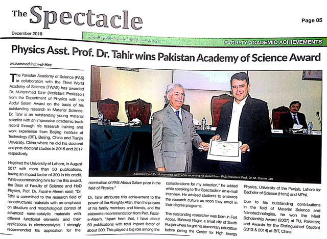 据the Spectacle报道,2018年12月,巴基斯坦科学院和发展中国家科学院授予我校材料学院2011级校友、巴基斯坦籍博士研究生塔黑尔(MUHAMMAD TAHIR)“阿卜杜勒·萨拉姆奖(Abdus Salam Award)”,以奖励其在材料科学研究方面取得的成就。