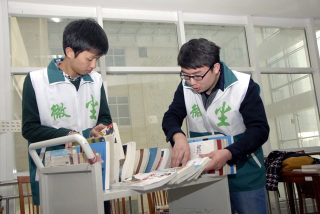 图书馆里,有这样一群人,他们推着书车来往于各个阅览室-顺号、上书、排架;他们活跃于图书馆开展的每一次活动里,台前幕后都有他们的身影。他们既是读者,又是工作人员。他们比普通读者更了解图书馆的资源和服务;又比图书馆员更理解读者们的信息需求和特征。没有名、没有利,即使在重复而琐碎的工作里,他们依然快乐的奉献着,他们就是图书馆里最可爱的学生志愿者。