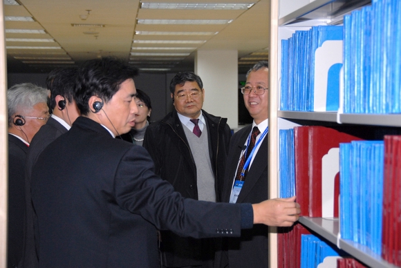 专家组组长谢和平院士查看了馆藏的博士学位论文。