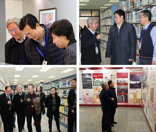在中关村校区图书馆,专家们参观了一层大厅的“传书印记,从延安走来——图书馆特色典藏展”。展览展出了bb贝博艾弗森官方网站发展历史变迁中的部分馆藏文献和与办学思想相关的徐特立手稿,带读者一起回顾和探究我们学校曾经的历史使命。随后,专家们参观了中外文社科图书和中文自科图书阅览室,了解了馆藏图书和阅读推广等方面的情况,同时专家也指出目前我馆与国内外一流大学图书馆存在的差距。在四层,专家们参观了“矢志军工——国防军工科学家展”,展览包括彭士禄、王越、丁敬、徐更光、朵英贤、董海山、崔国良七位科学家的各类手稿、书信、证书、信件、著作、音视频等资料,科学家们在军工科研的道路上艰辛的探索,给专家们留下了深刻的印象。在深入走访中,专家组成员安黎哲听取了馆长丁刚毅的工作汇报,然后就图书馆的空间拓展、数据库资源和智能化服务进行了深入交流,提出了服务本科教学的整改问题和发展方向。