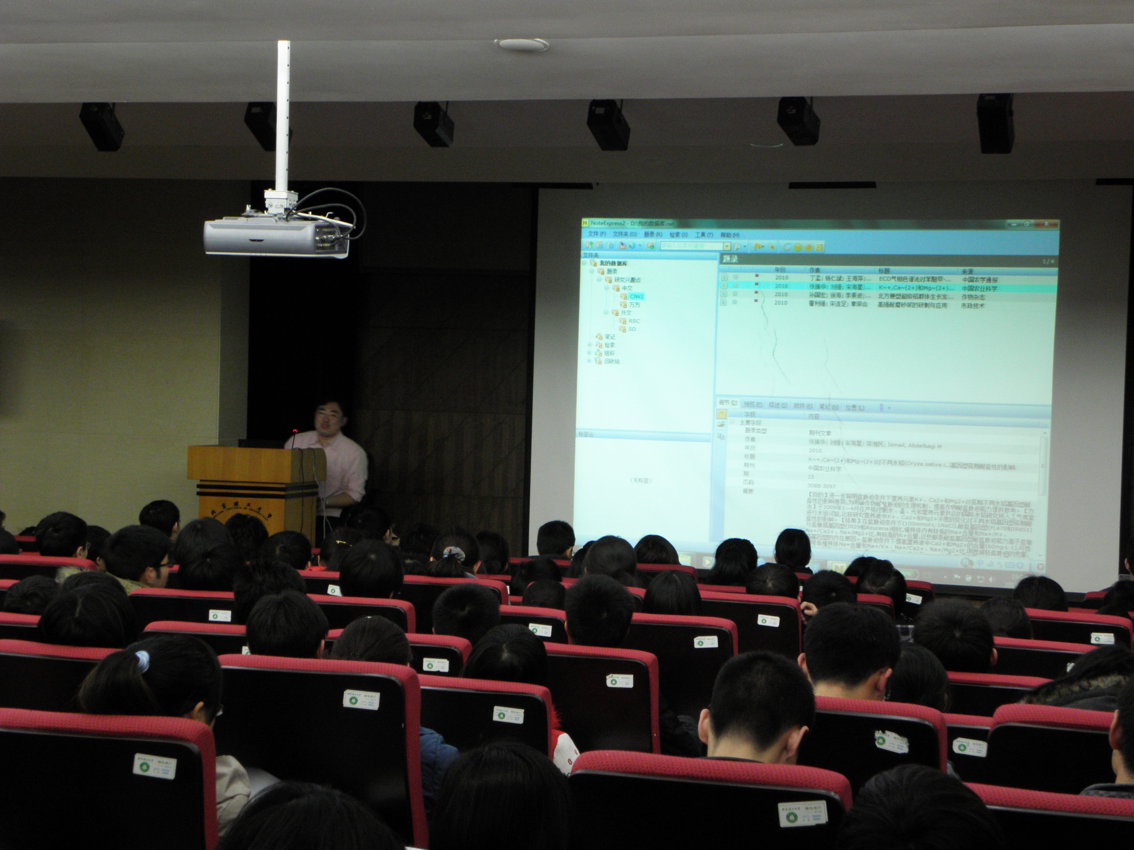 第一讲的内容是NoteExpress数据库培训。主讲教师以如何帮助读者提高论文写作质量和效率为题,从检索、管理、分析、写作等几个方面具体详细介绍了NoteExpress数据库以及功能。参加培训的读者积极踊跃地对自己所感兴趣的问题进行了提问,主讲教师逐一对大家提出的问题进行了解答。此次培训受到了读者广泛欢迎,参加踊跃,报告厅座无虚席。