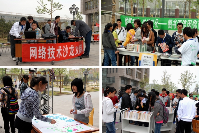 4月22日,为“相约4.23世界读书日”而举办的大型读书嘉年华活动将“图书馆文化节”推向高潮。图书馆四大沙龙——读书沙龙、英语沙龙、网络技术沙龙和绿萌书屋,以及“绿风志愿者”、“微尘志愿者”等学生社团分别开展了读书爱好者招募、好书分享、英语角、网络技术咨询及电脑义诊、图书漂流、新书荐购及展销、文明阅览DV短片展映、损毁图书展示、图书定向越野大赛、真人象棋表演等读书与文化主题活动,为同学们奉上了一道书香四溢的文化盛宴。