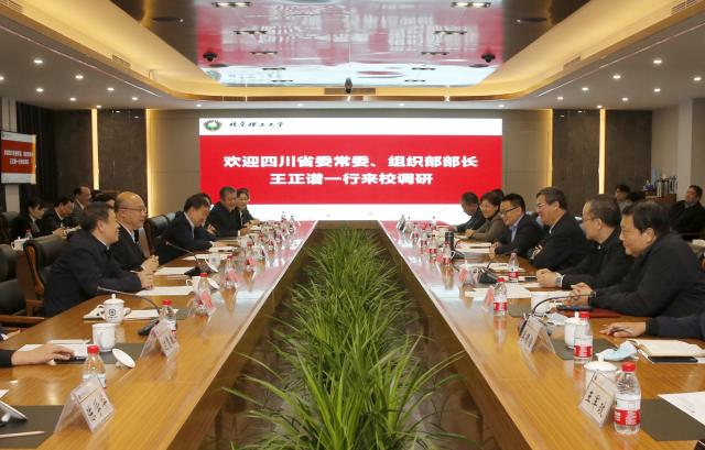10月28日,四川省委常委、组织部部长王正谱一行来校调研,推进省校战略合作。校长张军院士,副校长龙腾、王博,中国工程院院士吴锋参加座谈会。座谈会由王博主持。