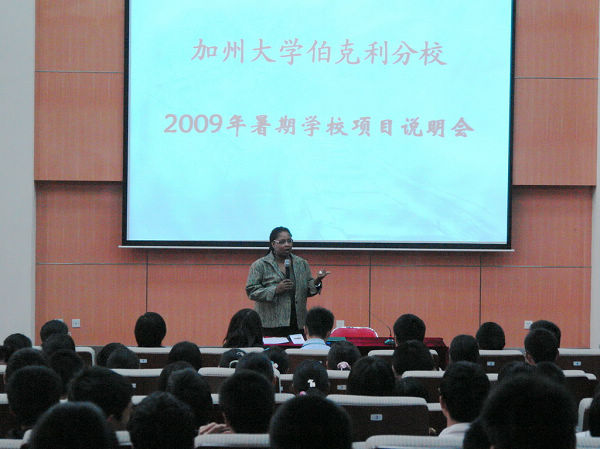 10月17日下午,加州大学伯克利分校校际合作项目主管 Skye Ward 女士应教务处的邀请来到我校,在我校国际交流合作处和教务处老师的全程陪同下,Skye Ward 女士不辞辛苦,连续在良乡校区和中关村校区举办了两次2009年暑期学校项目说明会。参会学生反映强烈,参与积极,他们良好的英语听说水平,给Skye Ward 女士留下深刻的印象。