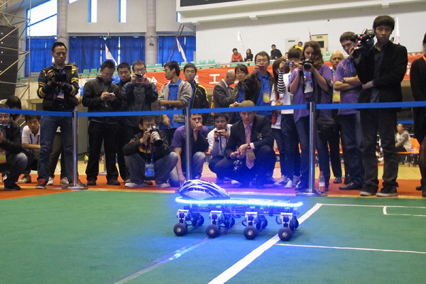 在机器人点球项目中,我校参赛机器人以高超的视觉技术为后盾,眼明脚准,取得了六射四中的好成绩,获得了此项比赛第二名,其极高的精准度得到众多观众的热烈喝彩。