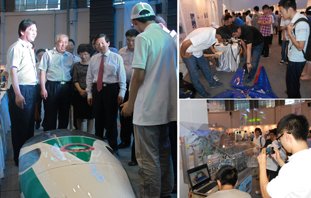 我校为参加此次成果展示与交流会进行了精心的准备工作,选送了“长征组歌”、“节能概念车”、“大视场普及型头盔显示器”、“垫升式起降技术验证机”、“基于物联网的超市快速结算系统”等大学生科研创新成果参加了展览,这些作品在展会上吸引了众多师生的目光,受到与会领导的高度关注。