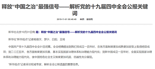 编辑:韩姗杉 审核:王征 阅读次数:原文标题:释放“中国之治”最强信号——解析党的十九届四中全会公报关键词