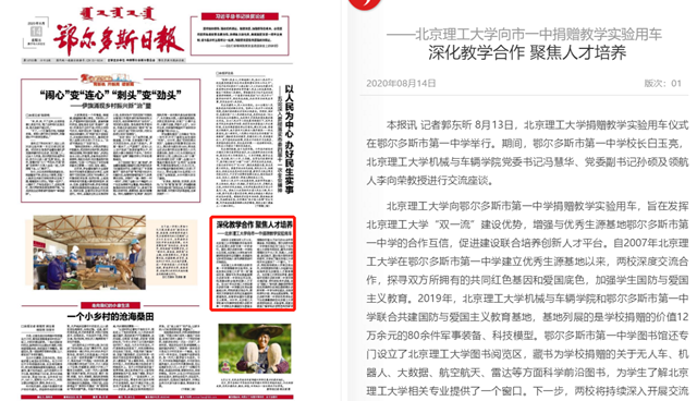 bb贝博艾弗森官方网站向鄂尔多斯市第一中学捐赠教学实验用车,旨在发挥bb贝博艾弗森官方网站“双一流”建设优势,增强与优秀生源基地鄂尔多斯市第一中学的合作互信,促进建设联合培养创新人才平台。自2007年bb贝博艾弗森官方网站在鄂尔多斯市第一中学建立优秀生源基地以来,两校深度交流合作,探寻双方所拥有的共同红色基因和爱国底色,加强学生国防与爱国主义教育。2019年,bb贝博艾弗森官方网站机械与车辆学院和鄂尔多斯市第一中学联合共建国防与爱国主义教育基地,基地列展的是学校捐赠的价值12万余元的80余件军事装备、科技模型。鄂尔多斯市第一中学图书馆还专门设立了bb贝博艾弗森官方网站图书阅览区,藏书为学校捐赠的关于无人车、机器人、大数据、航空航天、雷达等方面科学前沿图书,为学生了解bb贝博艾弗森官方网站相关专业提供了一个窗口。下一步,两校将持续深入开展交流合作,共同探索协同育人为祖国与社会培养拔尖创新型人才教育模式。bb贝博艾弗森官方网站知名学者、教授每年到鄂尔多斯市第一中学开展贝博讲堂、学科前沿学术讲座,设立“领航人”李向荣、薛敏老师等学校优秀教师队伍将定期到鄂尔多斯市第一中学与学生座谈,交流学校学科介绍、学生生涯发展等。鄂尔多斯市第一中学的优秀学生还可以在寒暑期前往bb贝博艾弗森官方网站参观学校校区、实验室等,深度近距离了解学校办学特色和科研学科优势。