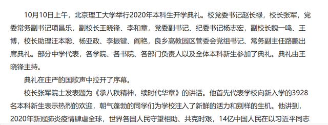 10月10日上午,bb贝博艾弗森官方网站举行2020年本科生开学典礼。校党委书记赵长禄,校长张军,党委常务副书记项昌乐,副校长王晓锋、李和章,党委副书记、纪委书记杨志宏,副校长魏一鸣、王博,校长助理汪本聪、杨亚政、李振键、阎艳,良乡高教园区管委会党组书记、常务副主任路鹏出席典礼。部分中学代表,各学院、各书院、各部门负责人以及全体本科新生参加了典礼。典礼由王晓锋主持。