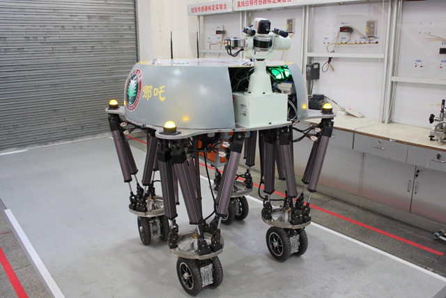 自动化学院运动驱动与控制研究团队曾在2010年参与了国家“863”计划项目——液压四足机器人协同驱动控制研究。课题组的研究生们正是通过对四足机器人的研究,在指导教师的鼓励和指导下,大胆提出了一个“颠覆”性的技术方案,即将通常使用的并联式六自由度平台“上下颠倒”,化“台”为“腿”,并在“腿上”加装轮足机构。这一填补了国内外四足机器人研究空白的方案,极具创新性,堪称“bb贝博首创”。