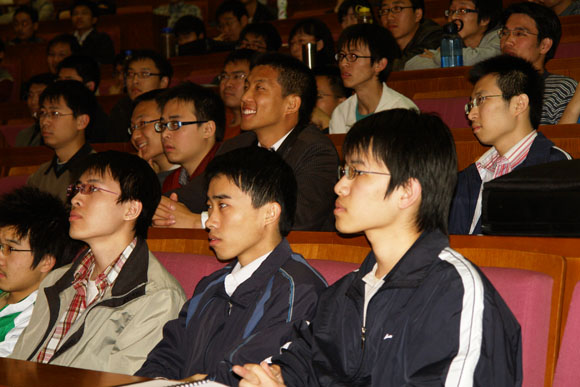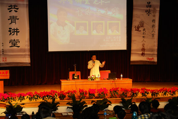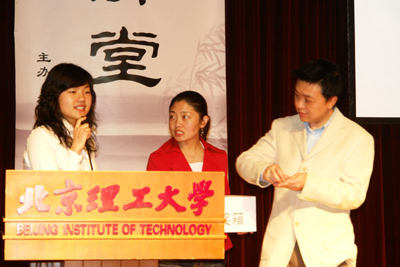 精彩的演讲不时赢得大家热烈的掌声。在提问环节,同学们踊跃提问,阐述自己的观点,董先生都友善而风趣的予以回答。最后,由董路先生抽出了本场讲座的幸运观众,获得由董路先生签名的个人CD和北京爱国者大学生足球队中甲贝博首次主场(本月21日)的入场券。