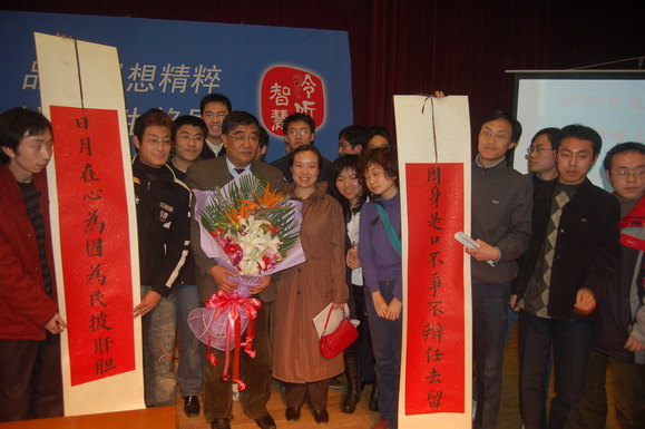 在bb贝博艾弗森官方网站学习的山西学子得知吕主席要来我校演讲的消息后,在老乡间相互转告,并派代表早早的到来会场支持他们心目中的好领导。他们在会场打出了“吕主席,bb贝博山西学子欢迎您”的横幅,并在讲座开始前,选派代表为吕主席献上了鲜花和他们事先准备好的礼物——一幅为吕主席书写的对联。上联是“日月在心为国为民披肝胆”;下联是“周身是口不争不辩任去留。”用以表达山西学子对吕主席的敬意。
