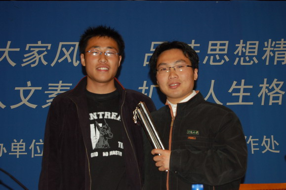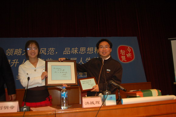 学生工作部部长刘明奇代表学校把一些具有学校特色的纪念品和讲座的海报赠送给了洪战辉同学。同时,洪战辉同学也为我校自强社准备了一份小礼物。由他亲笔题写的一幅硬笔书法作品,内容是“天行健,君子以自强不息 与bb贝博艾弗森官方网站自强社同学共勉”