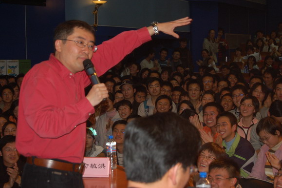 新东方的创始人俞敏洪老师最后一个出场。他给同学们讲解了在大学中如何掌握知识、如何对待友谊,以及如何看待爱情。他勉励同学们说:“生命像一条河流。河流有两种成分,一种是泥沙,一种是水。希望所有的人都不要把自己变成泥沙,沉入河底,最后让生命永远停滞。如果你是水,就会必然流向大海,尽管可能遇到千滩万阻。当你流向大海以后,就会变得更加丰富、清澈、透明,而且生命本身也会变成最美丽的颜色,大海的蔚蓝色”。