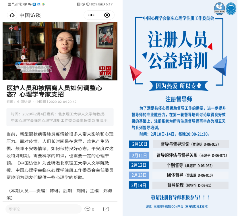 同时,作为注册工作委员会主任委员,她也带领专家团队为国家政府部门献言献策,并帮助撰写相关文件,如卫健委出台发布的疫情期间心理热线工作指南等。在武汉方舱医院刚启动建立,就立即提交卫健委关于方舱医院心理援助意见书,目前方舱医院的许多有利于患者和医护人员心理健康的方式、方法多来自意见书。同时,贾晓明教授积极致力于组织引导注册工作委员会注册督导师、心理师、助理心理师在全国各地开展心理援助工作,1月28日至2月14日期间,贾晓明教授组织临床心理学注册工作委员会专门在晚间为注册督导师开展心理援助督导培训,共举办了14场讲座,这些督导师都是国内心理咨询与治疗的专家,将组织他们起来系统培训能够有效提升抗疫心理援助工作的水平及影响力。此外,贾晓明教授积极配合各地政府搭建政府心理支援服务平台,特别是为支援武汉前线的医护人员和心理援助人员提供直接心理援助,2月2日她为处于一线的武汉精神卫生中心热线咨询员做培训,2月14日情人节这一天她为武汉地区群众进行了主题为“不孤独,因为我们在一起”的倾情讲座。