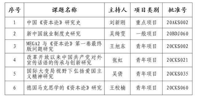 近日,全国哲学社会科学规划办公室公布了2020年国家社科基金年度项目和青年项目的立项结果,马克思主义学院教师共获批6项国家社科基金项目,其中重点项目1项、一般项目1项,青年项目4项。此次申报工作中实现了三个突破:一是首次获批重点项目;二是一年立项总数首次达到6项,位居全国高校马院前列;三是在党史党建、马列科社领域中,青年项目总数位居全国第一。