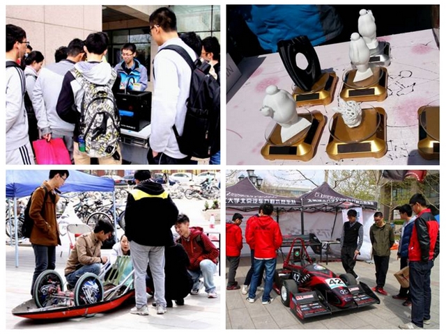 下午的学生科技创新成果展览中,共分为学生科协培育作品、“3D打印”体验展示、学院三大车队(方程式赛车、节能车、智能车)等展区。学生科协培育作品展区展出了学院的16项学生科技创新作品,同时开展了学生科协形象宣传活动,增加了同学们对学院学生科协的了解。在“3D打印”体验展区,学院学生科协安排专人进行了详细讲解,让同学们触摸新科技,此外,还对前期“3D打印方案设计大赛”中的优胜者现场打印其设计作品。“黑鲨Ⅴ”汽油机方程式赛车、纯电动节能赛车以及光电、电磁、摄像头三种类型的智能小车赢得了广泛关注,现场的同学中有很多是慕名而来,并在现场提交报名材料希望能够加入车队。