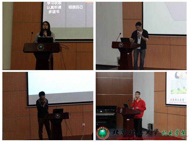 优秀班长孙亚伦,讲述了自己从外语转到特能专业过程中遇到的困难、付出的努力、得到的收获,鼓励同学们要坚持自己的目标,不懈努力;科创榜样高枫通过分享自己的暑期社会实践,让大家意识到科技创新的重要性,鼓励大家勤思考,将思考付诸实践;优秀学生姜鑫洋分享了自己求学路上的点点滴滴,希望学弟学妹刻苦学习的同时,能够为社会做一些力所能及的事;2011级党支部书记哈海荣,以“努力提升自我,积极服务同学”为主题,介绍了自己在增强党支部凝聚力和战斗力、促进党员同志成长过程中所做的工作,给大一大二的党团活动开展提供了非常好的经验。
