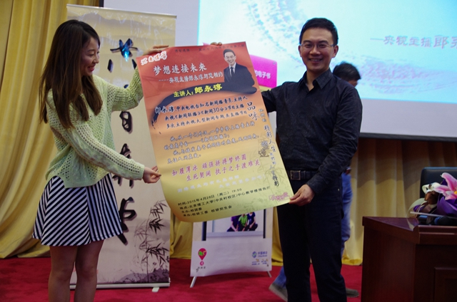 台上妙语连珠,台下掌声不断,学生代表向郎永淳赠送了本场讲座的海报作为礼物,活动在热烈掌声中圆满落下帷幕。虽然讲座结束了,但讲座的内容和郎永淳所传递的精神会在校园内形成影响,激励着那些拼搏在追梦路上的人们。