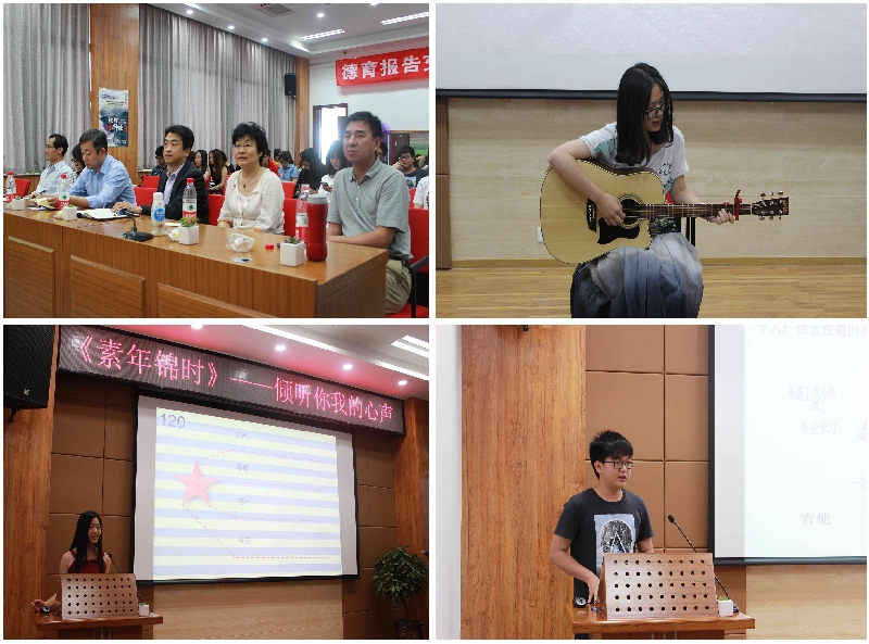 “素年锦时”、“我的青春,不将就”分别是23111401班和23111402班德育开题报告会的主题。各班分别通过微信留言墙、随机抽取同学之间的“悄悄话”、播放班级视频、抽取童年的“萌照”等形式来组织开展德育开题活动。同学们展示了一年来自己的大学生活体验,有收获亦有遗憾。除了专业学习,在活动现场,原创歌曲赢得满堂彩;手工制作的精美布偶作品和手绘图册,让同学们了解到全新的自己;一句句“心灵鸡汤”既感动了自己,也感动了别人;一张张唯美的照片,或搞笑、或比美、或友爱,都彰显了同学们“热爱,尝试,坚持”的人生信条。