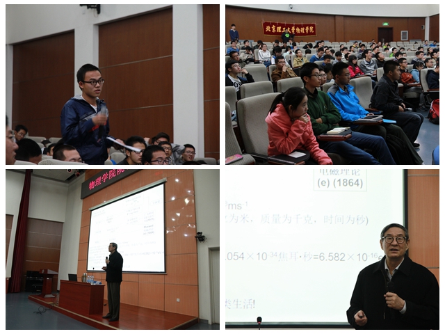 为了帮助2015级本科新生尽快完成角色转变、确定发展目标,物理学院结合《一年级工程实施计划》,于11月3日特别邀请到中国科学院院士、物理学院院长葛墨林先生前往良乡校区与学院本科生进行交流,为大家做题为《物理不是八股》的主题报告。参与此次交流活动的还有物理学院党委副书记、副院长杨艳波老师,物理学院办公室主任姚远老师以及学院2013、2014、2015级本科生。