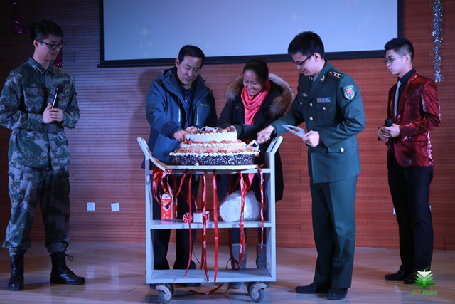 最令人感动与惊喜的,是晚会预设的神秘环节。选培办为大家准备了生日蛋糕,这是对国防生元旦晚会十周年的献礼,象征着历届国防生的成长和进步,同时也饱含了对所有在校国防生美好未来的祝福。秦主任、许副处长与国防生家长代表亲自为大家切分蛋糕,寓意每一名国防生的成长都离不开选培办领导、学校领导和学生家长的关怀与培养。秦主任赞扬了国防生牢记使命、不负重托的精神,肯定了2015年国防生完成的各项任务,并鼓励全体国防生为了心中的梦想刻苦奋进,努力打造bb贝博国防生品牌。学生工作处副处长许欣老师称赞了国防生敢为人先的良好形象,激励大家在学校努力学习、做好榜样,在部队建功立业、成为栋梁。2015级国防生金哲毅的父亲金连柱代表国防生家长对选培办与学校的辛勤培育表示感谢,对国防生的茁壮成长寄予厚望。
