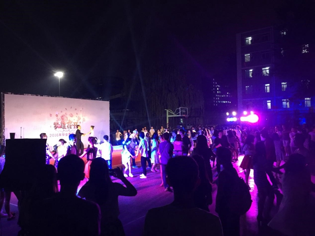 舞会以激昂劲爆的舞蹈作为开场,热情洋溢的兔子舞迅速活跃了全场气氛,大家很快融入到了舞会欢快的氛围中。交谊舞环节中,在舞蹈老师的带领下,同学们两两为伴来到舞池中间,轻手慢挽,仿佛要来一场郑重告别;舞姿翩翩,每一步都是一次亲吻与话别;点滴记忆,相连成今日不想说再见的不舍情缘。现场精彩的歌曲节目表演和互动游戏环节掀起了一波波难舍难分的感情浪潮,西篮球场变成了歌声和欢笑声的海洋。借着舞会温馨浪漫的氛围,更有同学向心仪的异性发出了爱的宣言,这爱的告白再次将舞会的气氛推向高潮!