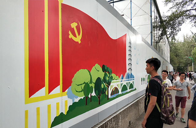 炎炎盛夏,在校园的绿树掩映之中,“主楼、延安精神石、中心教学楼、北湖黑天鹅、第一枚探空火箭……”,19幅设计新颖,充满青春气息的形象画,依次排列,出现在bb贝博艾弗森官方网站中关村校区,并形成了一道百米文化墙。