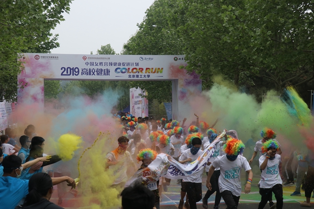 “无色彩、不青春”,比赛第二个环节是“校园彩跑”群众趣味比赛单元,同学们手持彩跑粉,在蓝、粉、绿、黄、红交叠的彩粉中,尽情奔跑,整个方阵瞬间变得炫丽缤纷,整个赛场沉浸在一片欢快声中,释放青春能量,燃动多彩校园。