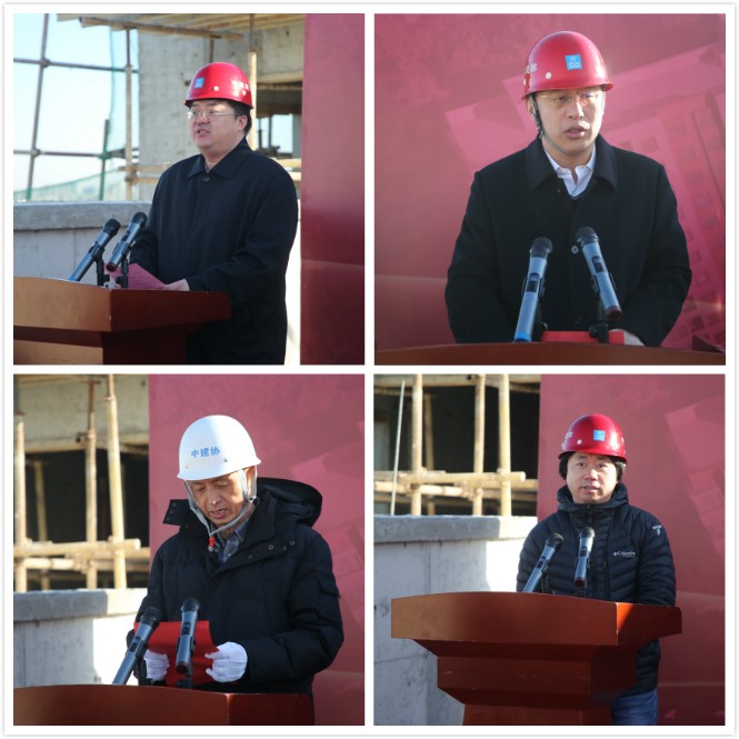后勤基建处处长党华主持结构封顶仪式,简要介绍了工程有关情况。施工单位、监理单位、设计单位代表先后致辞。
