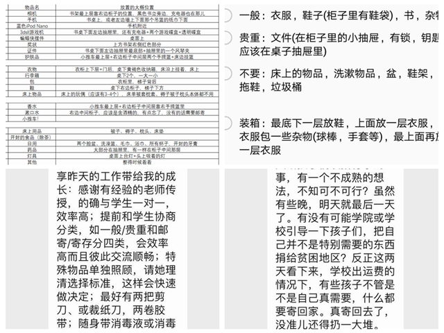 根据工作实际,志愿者们及时总结并交流经验。部分老师建议提前与学生进行一对一沟通,以便提高工作效率;部分老师号召同学们将不用的物品捐给有需要的人,将爱心传递下去。