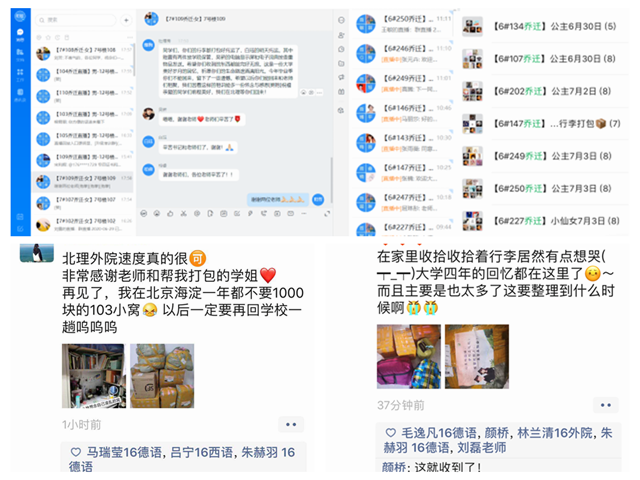 自6月11日北京新发地疫情发生以来,外国语学院高度重视,迅速反应,按照北京市疫情防控相关要求,结合学校《疫情防控工作指南》《毕业生离校工作方案》,学院以“围绕学生、关照学生、服务学生”为中心,成立毕业生离校工作领导小组,确保2020届毕业生离校工作的顺利进行。学院领导班子带头,师生党员充分发挥先锋模范作用,60多名教师和在校生积极担任志愿者,集中完成毕业生行李寄送工作。身在各地的毕业生也积极响应、高度配合,大幅提升了工作效率。