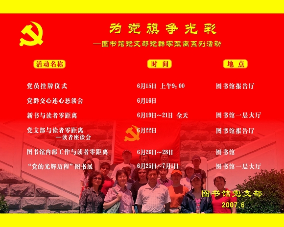 图书馆党支部组织的“为党旗争光彩——党群零距离系列活动”近日圆满落幕。此次活动为期15天,活动内容有党员挂牌暨重温入党誓词仪式、党群交心连心恳谈会、党支部与读者零距离、新书与读者零距离、图书馆内部工作与读者零距离和“党的光辉历程”图书展等,活动的目的是增强党员的理想信念和宗旨观念,进一步激发党员全心全意为人民服务的积极性,通过党员与群众面对面的沟通,提高党员服务群众的自觉性。