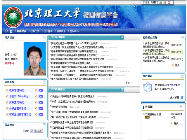 * 单点登录:将校内各个常用办公系统集中链接,并实现“一次配置,永久登录”功能