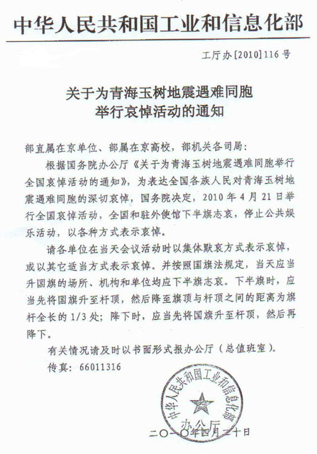 关于为青海玉树地震遇难同胞举行哀悼活动的通知