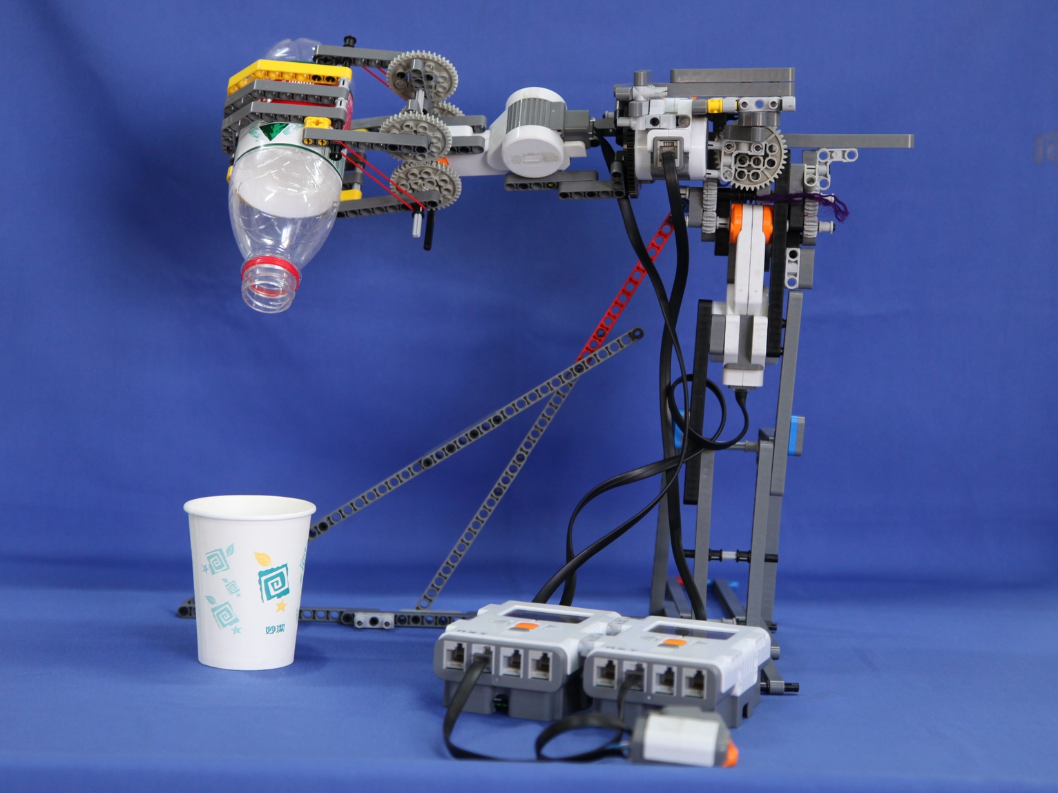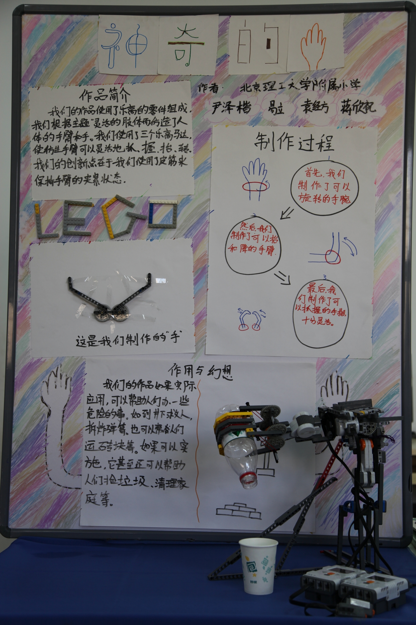 四名学生首先确定设计的题目“灵活的手”,然后自主设计完成体现“灵活的手”的结构并进行搭建,最后通过编程、调试赋予这只“手”以生命。学生们所做的“灵活的手”可以自动拿住矿泉瓶往杯子里倒水,其结构巧妙并能按照指令完成预定的任务。令评委赞叹不已!之后学生们将作品简介、工作流程图等设计成展板进行展示,接受评为的问辩。